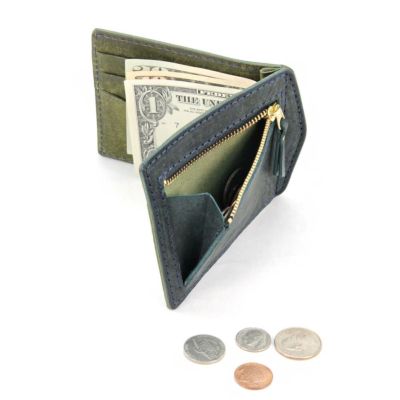 カードポケット3枚分+サブポケット1ヵ所、札をクリップで挟んで持つスタイル、マネークリップでは比較的珍しい小銭入れを表面に搭載。