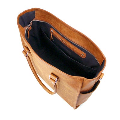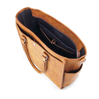 内装はA4ファイルやタブレット端末も収納可能なシンプルな内装設計。小物ポケット2か所とその後ろに仕切りスペース、逆側にも同仕切りスペースとファスナーポケットを搭載し小物の仕分けなどにも有効
