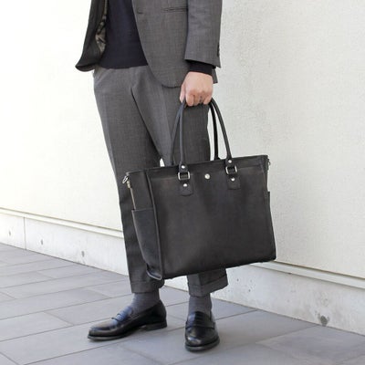 フロントポケットを搭載したビジネスバッグでショルダーストラップ付の為2WAY仕様。底鋲付のため自立可能