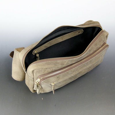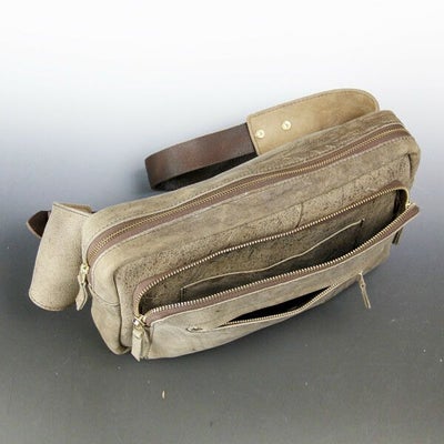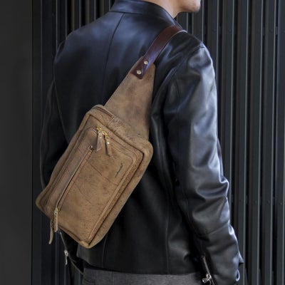 クーズーの表面感を活かしたボックス状レザーボディバッグ。