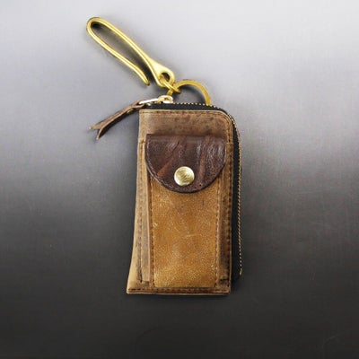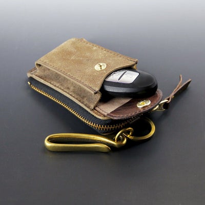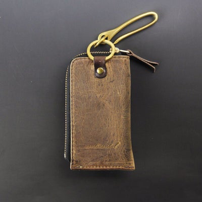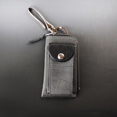 スマートキーやインテリジェントキーが入るポケット付レザーキーケース。車のキーは外ポケットに入れておきよく使う家カギなどはファスナー内のリングに収納可能