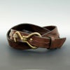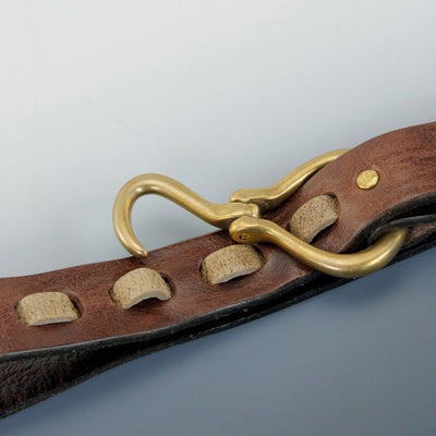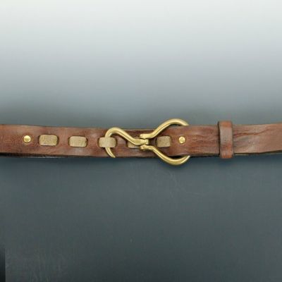 イタリア伝統皮革のベルトで存在感のある真鍮製フックをクーズーのホールに挿して留めていくデザイン性の高いベルト。さらに使い込んでいくごとに色、艶が増し、表面感の毛羽立ちも変化し滑らかになるなど一般的な革の経年変化では味わうことのできない独特な深い風合いになっていきます。
