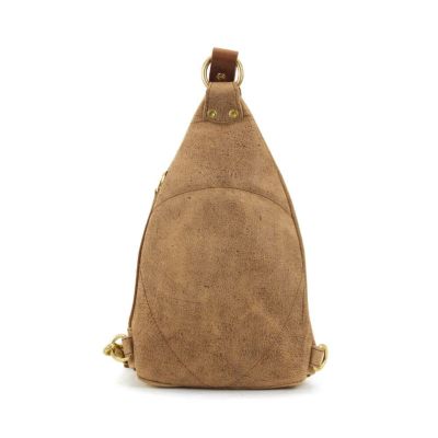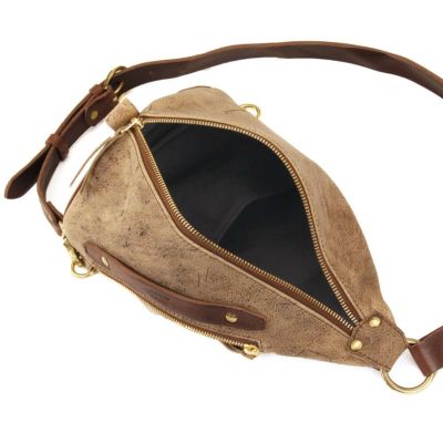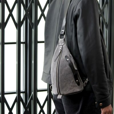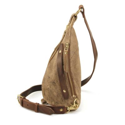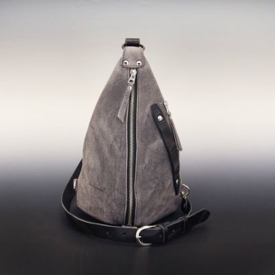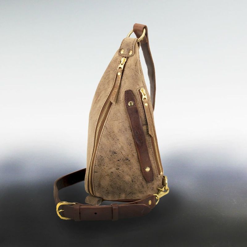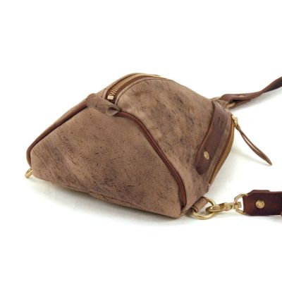 クーズーの表面感を活かし、デザイン的な他では無い三角袋状のレザーボディバッグをリサイズしたMサイズver.