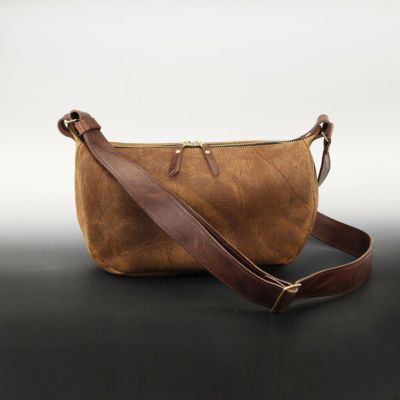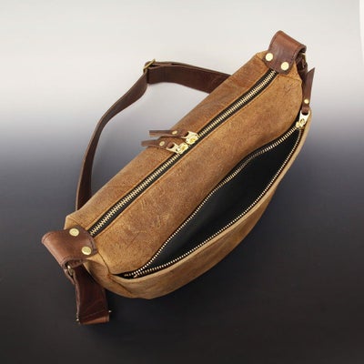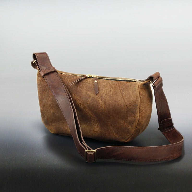 クーズーの表面感を活かし、より普段使いの利便性と持ちやすいサイズ感の両立を求めたシンプルな袋状ショルダーバッグ。