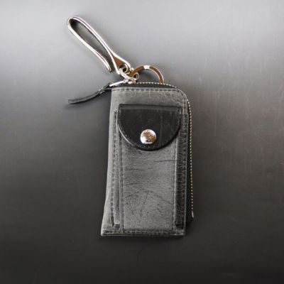 スマートキーやインテリジェントキーが入るポケット付レザーキーケース。車のキーは外ポケットに入れておきよく使う家カギなどはファスナー内のリングに収納可能