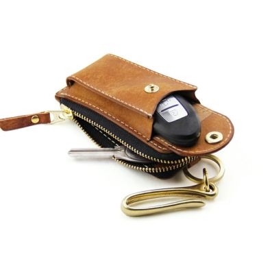 スマートキーやインテリジェントキーが入るポケット付レザーキーケース。車のキーは外ポケットに入れておきよく使う家カギなどはファスナー内のリングに収納可能