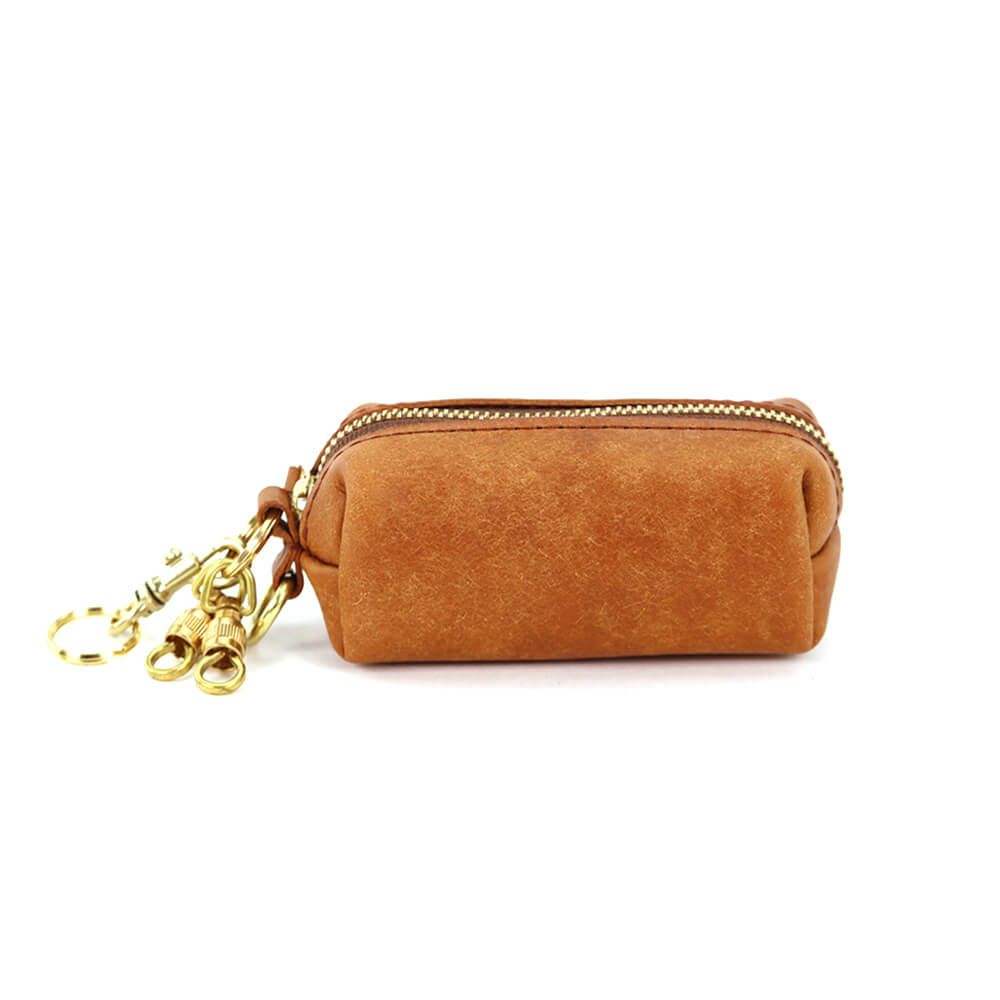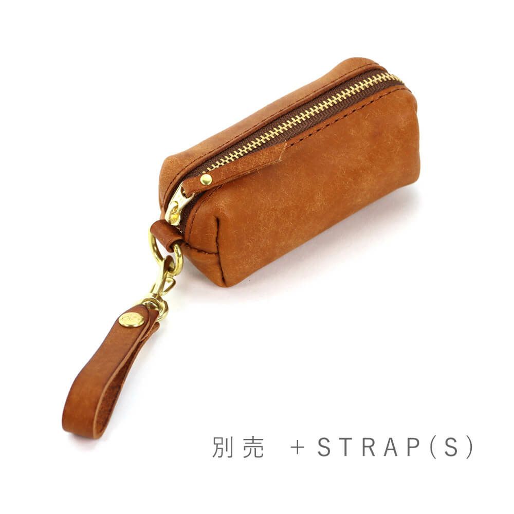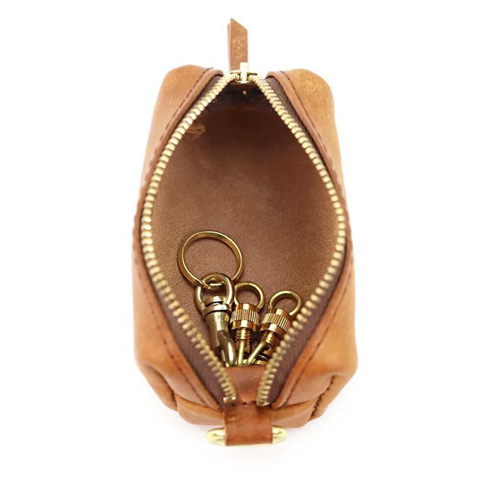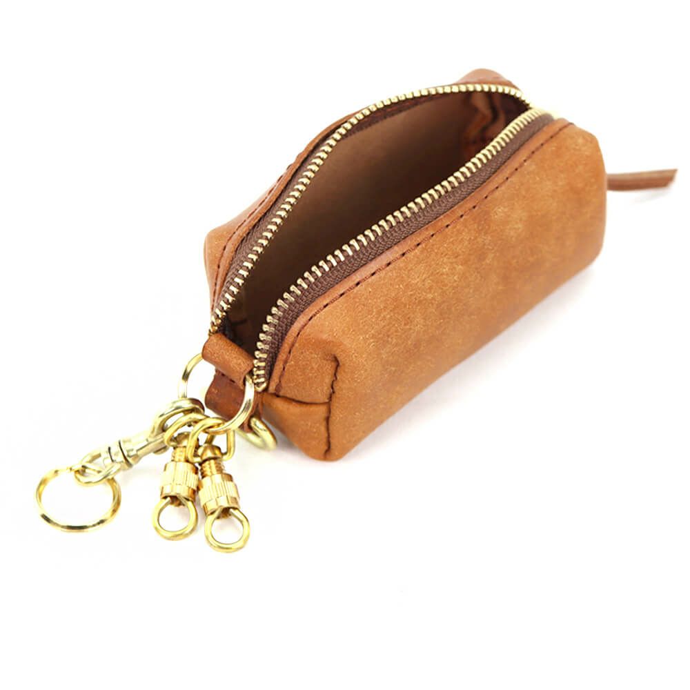 箱掛かった袋状にデザインされたキーケースで大きめのスマートキーも複数収納が可能、内装に巻き込めるRING部分には真鍮製ネジ式金具×2、着脱用のナスカン金具×1を搭載(ご自身でリングを追加する事で増築も可能)