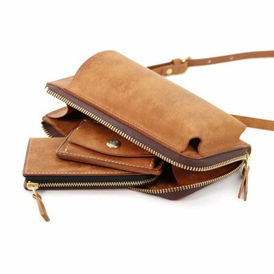 スマートフォンを前面ポケットに収納し、ミニ財布や小物などを収めるサイドファスナー搭載