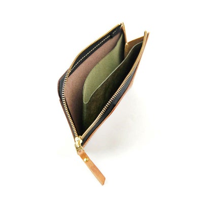 薄く仕事用の簡易財布にもなるようお札は二つ折りで収納でき、内装袋内に小銭なども収納可能。表面のカードスペースのさりげない配色がデザインにもなるボードタイプのコインケースです
